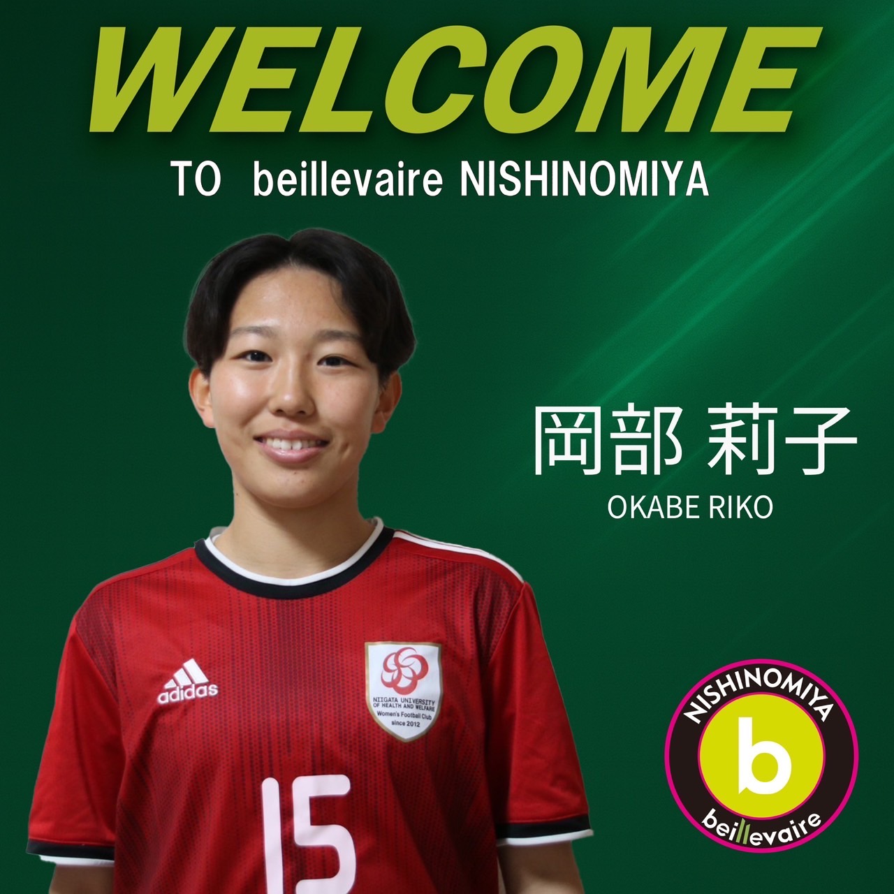 この度、beillevaire西宮に加入することになりました。新潟医療福祉大学所女子サッカー部の岡部莉子です。 チームの一員として迎え入れてくださったbeillevaire西宮の皆さま、そしてこれまで苦しい時も支え、応援してくださったすべての方々のおかげで、この素晴らしいチームでプレーできることを心から感謝しています。 その感謝の気持ちを忘れず、チームのために戦い、姿勢と結果で恩返しができるよう全力で取り組みます。応援よろしくお願いいたします。 |